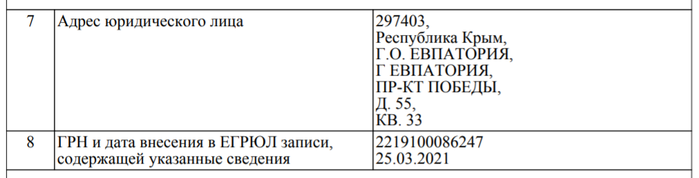 Пролистываем эту выписку и смотрим где находится юридический адрес кооператива. Юридический адрес кооператива находится в частной квартире по адресу г. Евпатория, пр-кт. Победы, д. 55, кв. 33