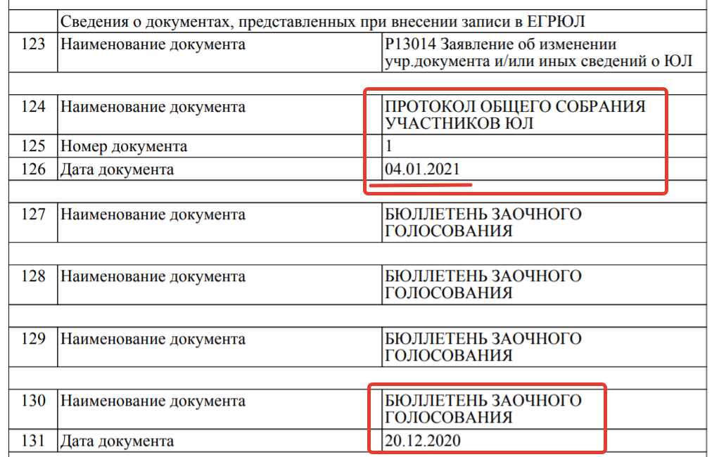 Далее смотрим на основании каких документов сделана эта запись. Основополагающим документом является «Протокол общего собрания участников ЮЛ» №1 от 04.01.21