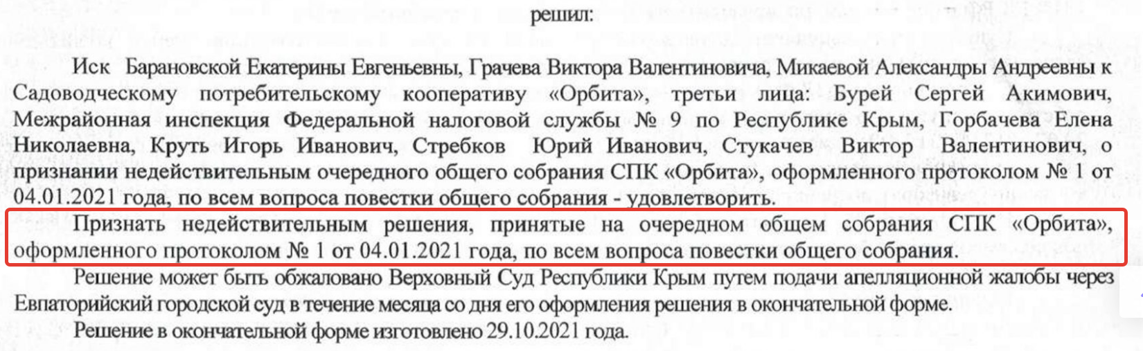 Далее самое интересное. Евпаторийский городской суд Республики Крым на своём заседании от 25 октября 2021 года признал недействительным решения принятые на этом собрании и оформленные этим протоколом. Решение суда можно посмотреть здесь