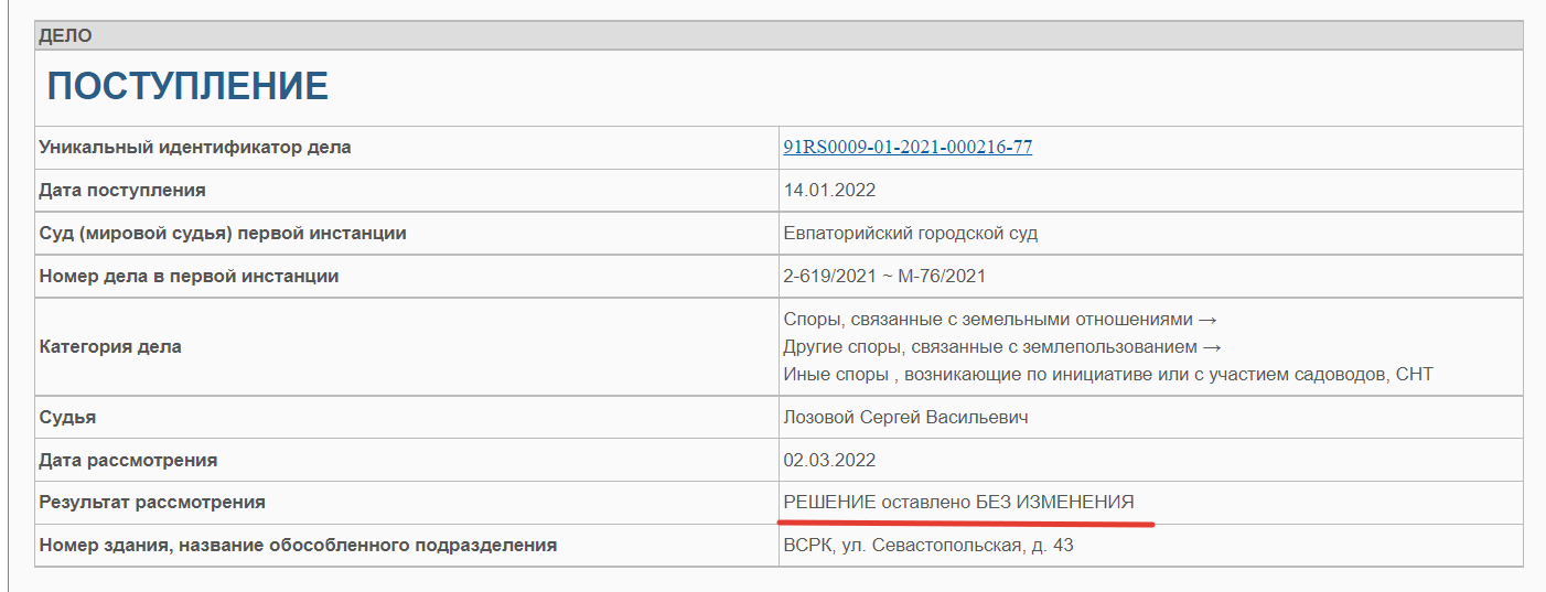 Разумеется Сергей Акимович не согласный с решением суда подал апелляцию. 2 марта 2022 года Верховный суд республики Крым на своём заседании решение Евпаторийского суда оставил без изменения