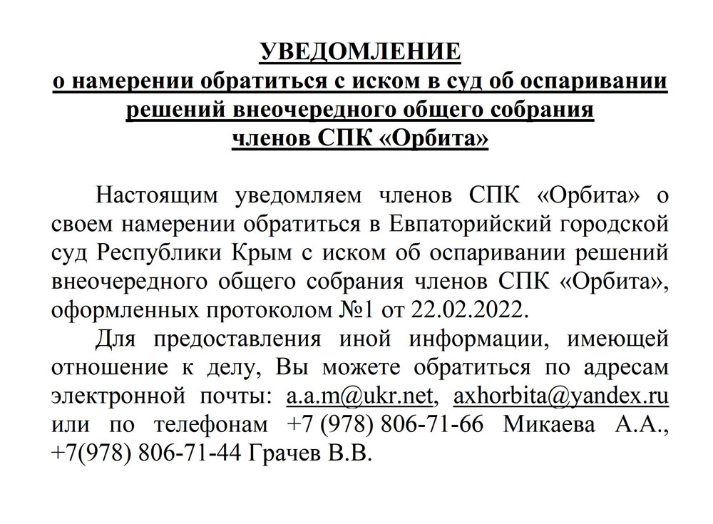 Настоящим уведомляем членов СПК «Орбита» о своем намерении обратиться в Евпаторийский городской суд Республики Крым с иском об оспаривании решений внеочередного общего собрания членов СПК «Орбита», оформленных протоколом №1 от 22.02.2022.
