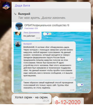 Это по поводу взлома меж групповой голосовалки который произошёл 6 декабря после 19 часов вечера. Я смог вычислить IP устройства с которого произошёл взлом и указал, что это IP принадлежит северо западному федеральному округу. Далее прошу Дядю Витю подтвердить свои обвинения скринами.