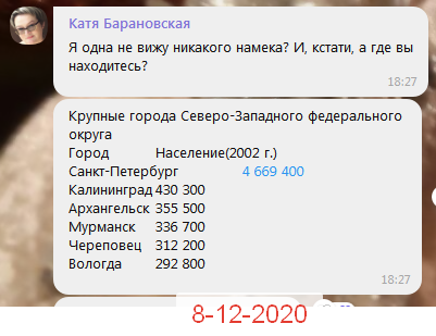 Далее Катя Барановская подняла список городов которые входят в северо западный федеральный округ, а это такие большие города как Питер, Калининград, Архангельск и другие.