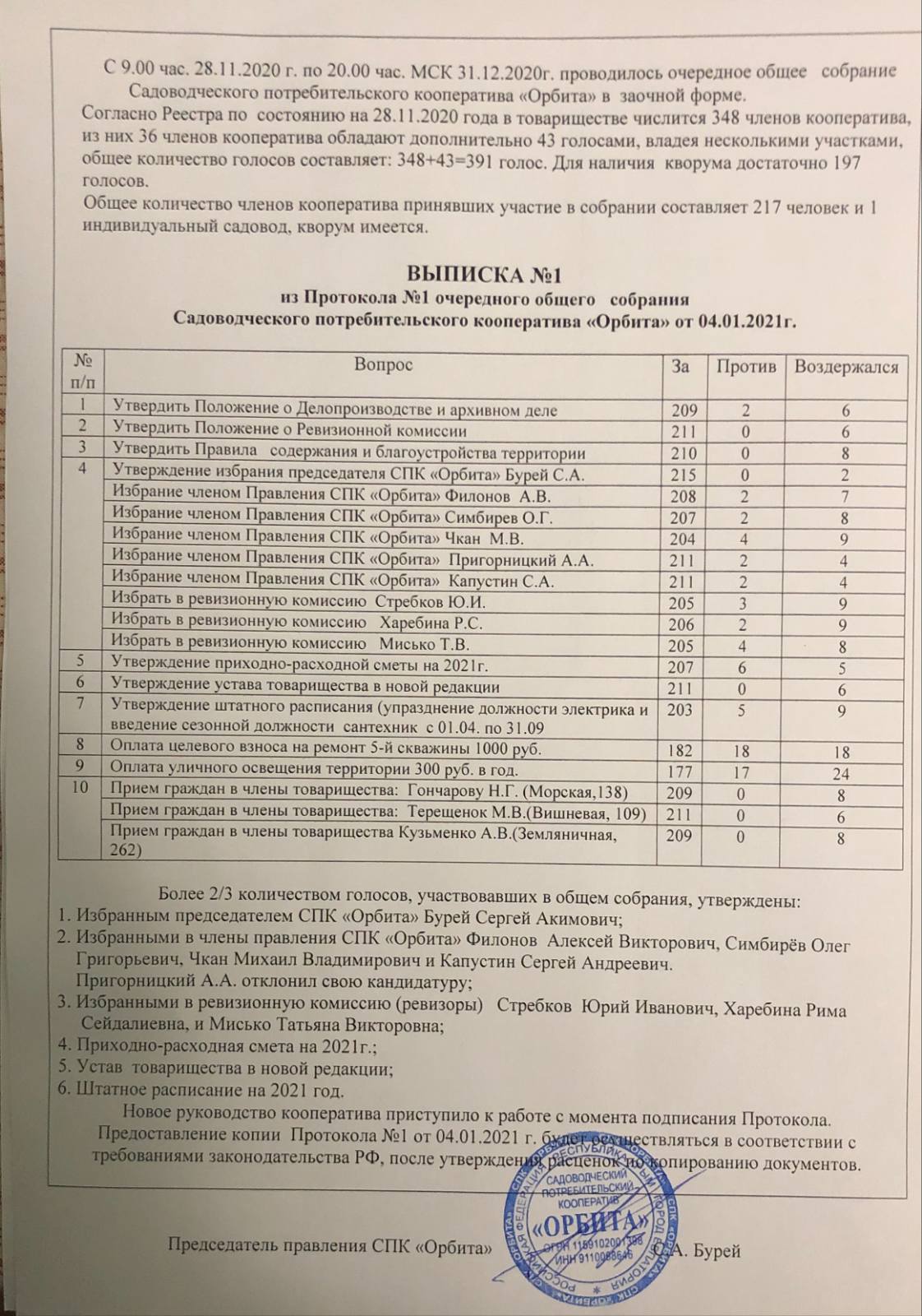 На этом собрании было подтверждено избрание председателем правления Бурея С.А., а также избрание членов правления СПК «Орбита» Филонова А.В., Симбирёва О.Г., Чкан М.В. и Капустина С. А.