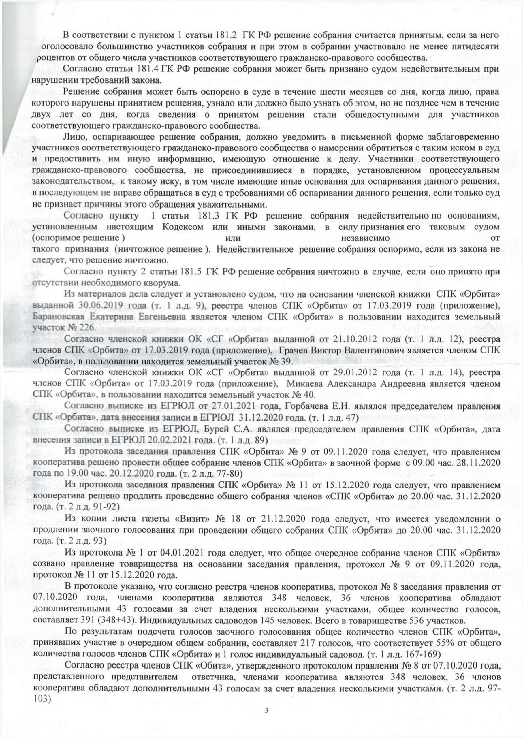 Решение суда о признании недействительным очередного общего собрания СПК «Орбита», оформленного протоколом № 1 от 04.01.2021 г. Лист 3